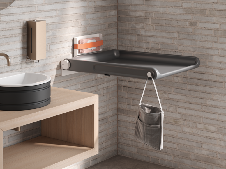 The new HEWI baby changing table combines an easy-to-clean lying surface made of PUR foam in iron grey with robust metal components in matt grain white. The braked fold-down function enables smooth handling, while side hooks and a clamp compartment offer additional comfort and convenience. The changing table combines the highest safety standards and comfortable handling with a modern design that blends seamlessly into public sanitary areas. The baby changing table was designed by Holscher Design, a renowned and award-winning strategic product design agency from Denmark with over 50 years of experience.
