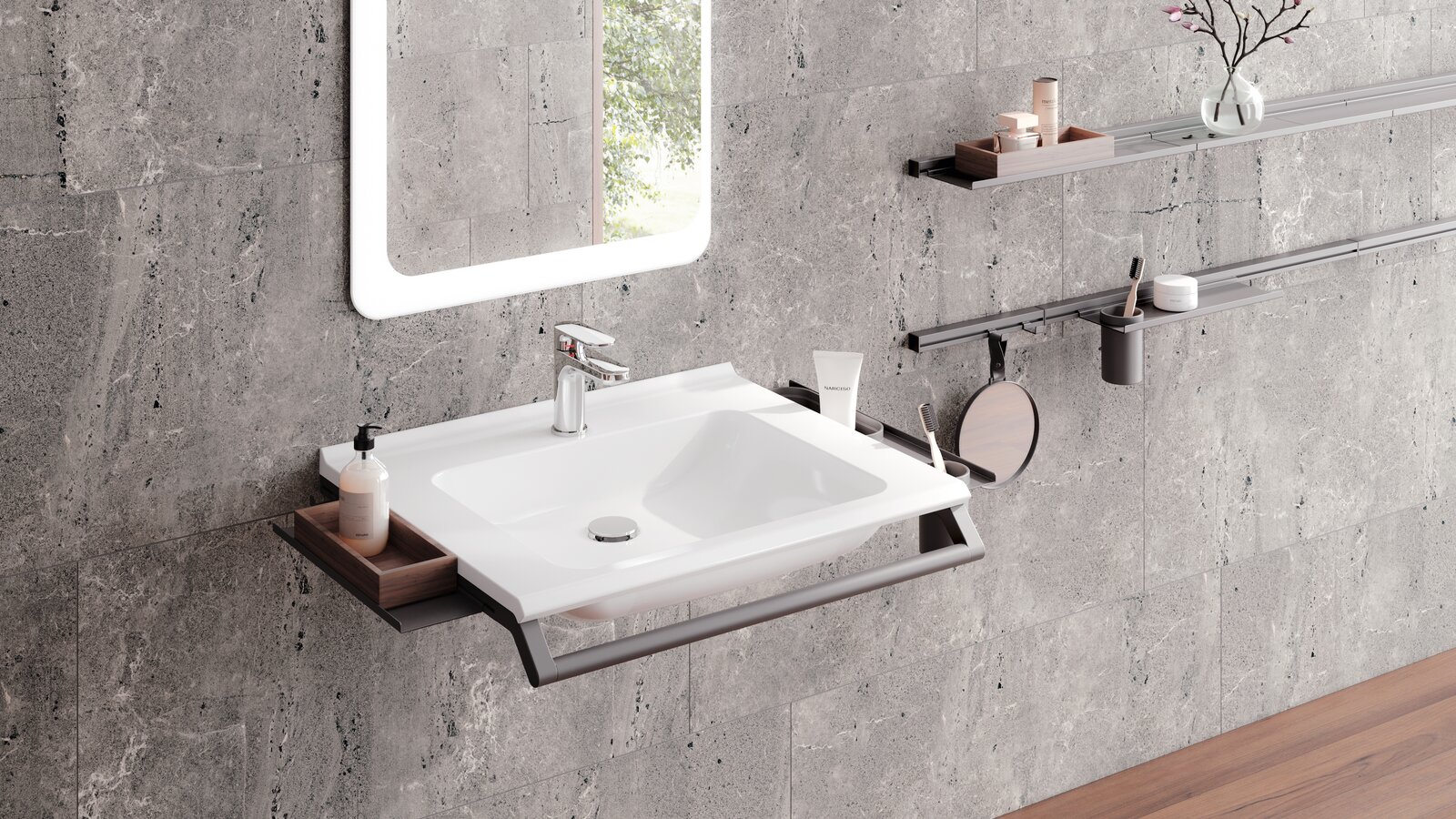 The washbasins are reduced due to the reduced material thickness and can be supplemented with important additional functions via supplementary products. The innovative concept enables the integration of an adaptive retaining handle, which also serves as a towel rail, and a modular storage system directly on the washbasin.