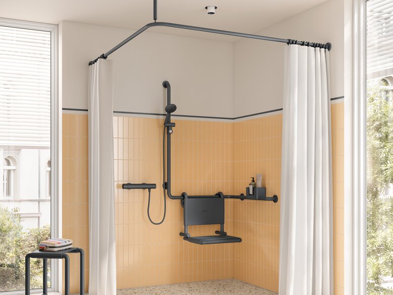 With Series 477/801 HEWI offers maximum flexibility. Its wide range of products can be easily adapted to individual requirements and structural conditions. Shower and bath handrails, angled grab rails, shower supports, shower curtain rails and shower curtains themselves, can be made to measure precisely to your specifications - from a single item to series production.