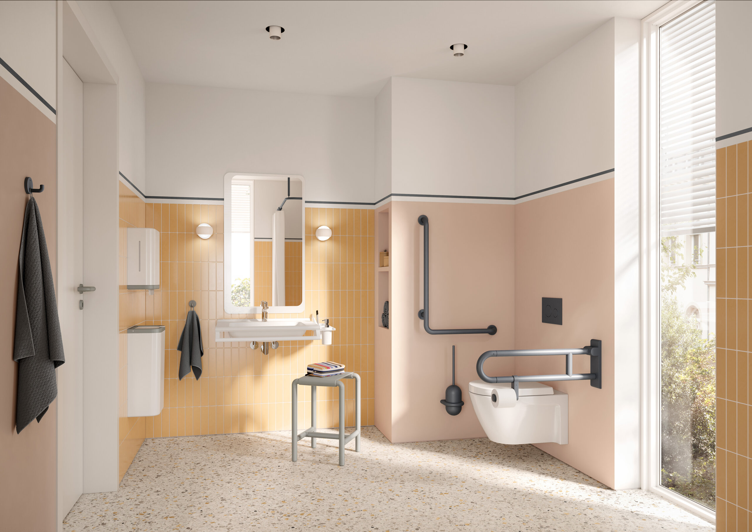 Series 477/801 offers a design alternative in a matt edition. This matt look and feel gives sanitary rooms in hospitals, retirement homes or nursing homes a homelike design alternative. Outstanding aesthetics and unlimited functionality are of course not mutually exclusive. The matt edition Series 477/801 products are available in various shades of white and grey. The unique depth of the range, from sanitary accessories to comfort products and accessible elements to lever handles, enables consistent furnishing concepts. The velvety finish of the matt edition is achieved through a particular finishing process. The result is a unique, premium quality design made in Germany.