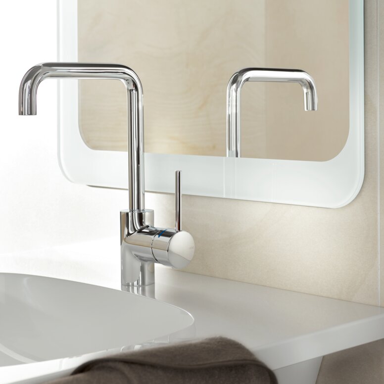 The single-lever washbasin mixers are equipped with an open operating lever. This allows them to be operated with just one finger making them easier to use for people with motor impairment.