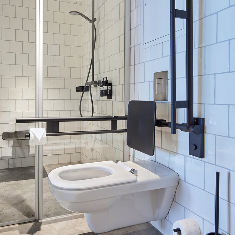Czarny budynek i elementy wystroju biegną jak czerwona nić przez projekt hotelu. Rozwiązania HEWI System 900 harmonijnie integrują się z łazienkami hotelowymi i pomieszczeniami sanitarnymi bez barier.