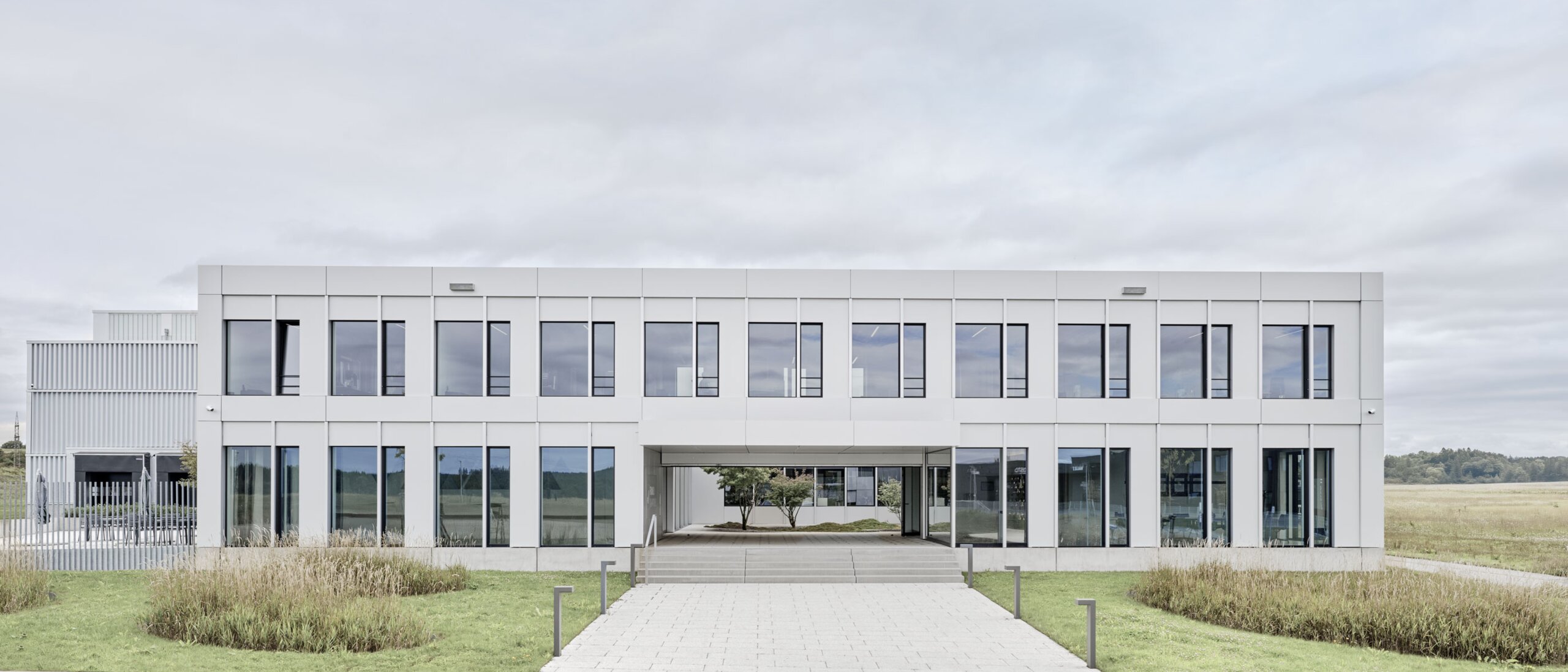 W strefie dostaw na samym końcu budynku dach jest wysunięty na zewnątrz - chroni przed wiatrem i warunkami atmosferycznymi oraz nadaje budownictwu łatwy, unoszący się wygląd. Starannie połączona, wysokiej jakości metalowa fasada mieni się delikatnym, aluminiowo-srebrnym połyskiem. Delikatny połysk nadaje mu łatwy wygląd, ponieważ harmonizuje z naturalnymi warunkami oświetleniowymi. Eliminuje to ciężar z objętości budynku. Jednocześnie fasada oznacza precyzję i doświadczenie - i już na pierwszy rzut oka pokazuje, o co chodzi we wnętrzu: Do precyzyjnej i złożonej obróbki metalu.